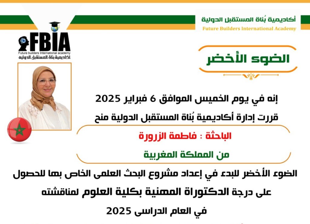 تعلن أكاديمية بناة المستقبل الدولية، تحت قيادة الدكتورة مها فؤاد، مطورة الفكر الإنساني ورئيس الأكاديمية، حصول الباحثة فاطمة الزرورة من المملكة المغربية على “الضوء الأخضر”، للبحث العلمي استمراراً لمبادراتها في تقديم الدبلومات في إدارة الأعمال والتنمية البشرية والعلوم الإنسانية الإرشادية، فضلاً عن درجات الماجستير والدكتوراه والاستاذية المهنية للعام الدراسي الجديد 2025.