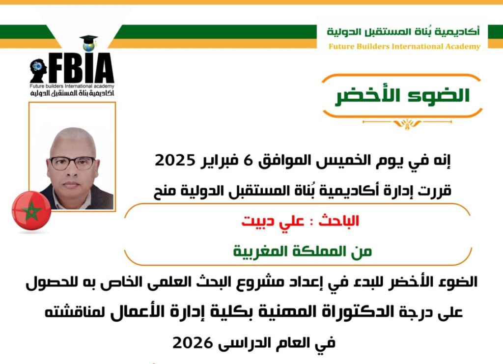 تعلن أكاديمية بناة المستقبل الدولية، تحت قيادة الدكتورة مها فؤاد، مطورة الفكر الإنساني ورئيس الأكاديمية، حصول الباحث علي دبيت من المملكة المغربية على “الضوء الأخضر”، للبحث العلمي استمراراً لمبادراتها في تقديم الدبلومات في إدارة الأعمال والتنمية البشرية والعلوم الإنسانية الإرشادية، فضلاً عن درجات الماجستير والدكتوراه والاستاذية المهنية للعام الدراسي الجديد 2025.