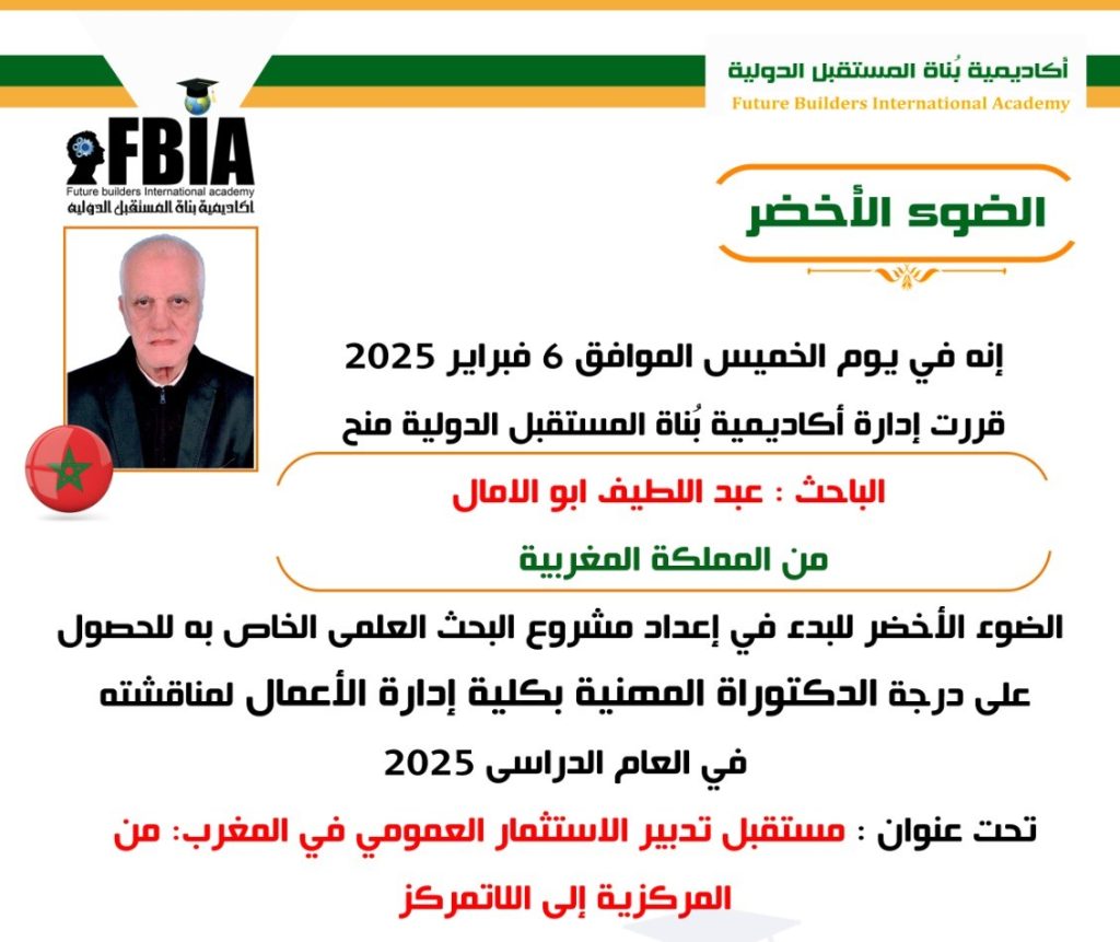 اختار الباحث عبد اللطيف ابو الامال موضوعًا ذا طابع علمي معاصر وهو” مستقبل تدبير الاستثمار العمومي في المغرب: من المركزية الى اللاتمركز” للحصول على درجة الدكتوراه المهني ، بكلية الاداب لمناقشته في العام الدراسي 2025.