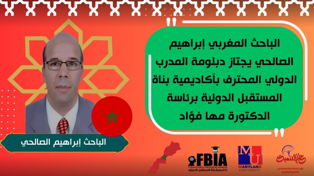 اجتاز الباحث إبراهيم الصالحي دبلومة المدرب الدولي المحترف بنجاح في أكاديمية بناة المستقبل الدولية، تحت إشراف الدكتورة مها فؤاد، رئيس مجلس إدارة الأكاديمية وراعية الابتكار والإبداع وريادة الأعمال في الوطن العربي.