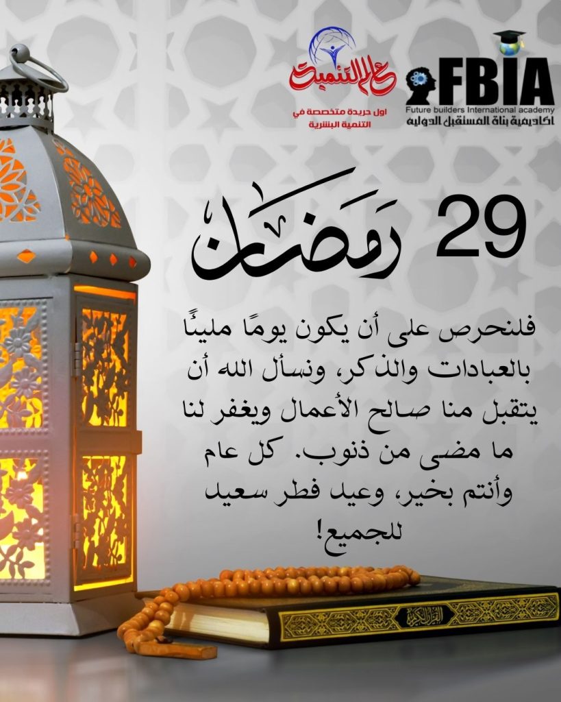 يعد اليوم 29 رمضان من الأيام المهمة في حياة المسلم، حيث يُختتم شهر رمضان بفرحة دينية خاصة، يتم خلالها التفكر فيما تحقق من طاعات وأعمال صالحة خلال الشهر. ومن جهة أخرى، يشهد هذا اليوم زيادة في العبادة والطاعات، مع إقبال من المسلمين على الدعاء والتقرب إلى الله، حيث يُعتبر هذا اليوم فرصة أخيرة للتوبة والاعتراف بالتقصير، إضافة إلى استجابة الدعوات التي يكثر الإلحاح بها في هذه الأيام.