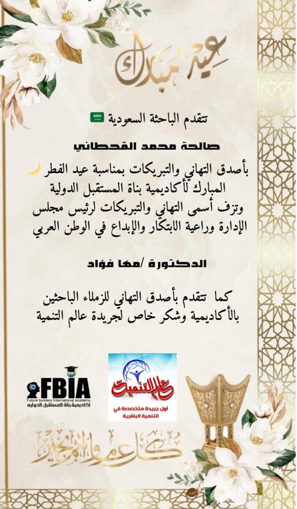 تتقدم الباحثة السعودية صالحة القحطاني بأصدق التهاني وأطيب التمنيات بمناسبة عيد الفطر المبارك إلى أكاديمية بناة المستقبل الدولية، وعلى رأسها الدكتورة مها فؤاد، رئيس مجلس إدارة الأكاديمية، وإلى جميع الزملاء الباحثين في الوطن العربي.