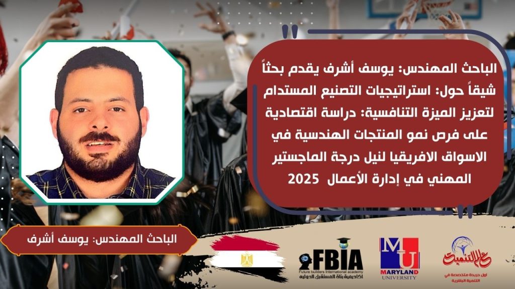 قدم المهندس يوسف أشرف بحثًا علميًا بعنوان “استراتيجيات التصنيع المستدام لتعزيز الميزة التنافسية: دراسة اقتصادية على فرص نمو المنتجات الهندسية في الأسواق الإفريقية”. تناول البحث موضوعًا حيويًا يتماشى مع التوجهات العالمية نحو التصنيع المستدام وتحديات السوق الإفريقية التي تتطلب حلولًا استراتيجية مبتكرة لضمان التنافسية المستدامة، في إطار سعيه لنيل درجة الماجستير المهني بكلية إدارة الأعمال لعام 2025، بأكاديمية بناة المستقبل الدولية تحت إشراف الدكتورة مها فؤاد رئيس الاكاديمية.