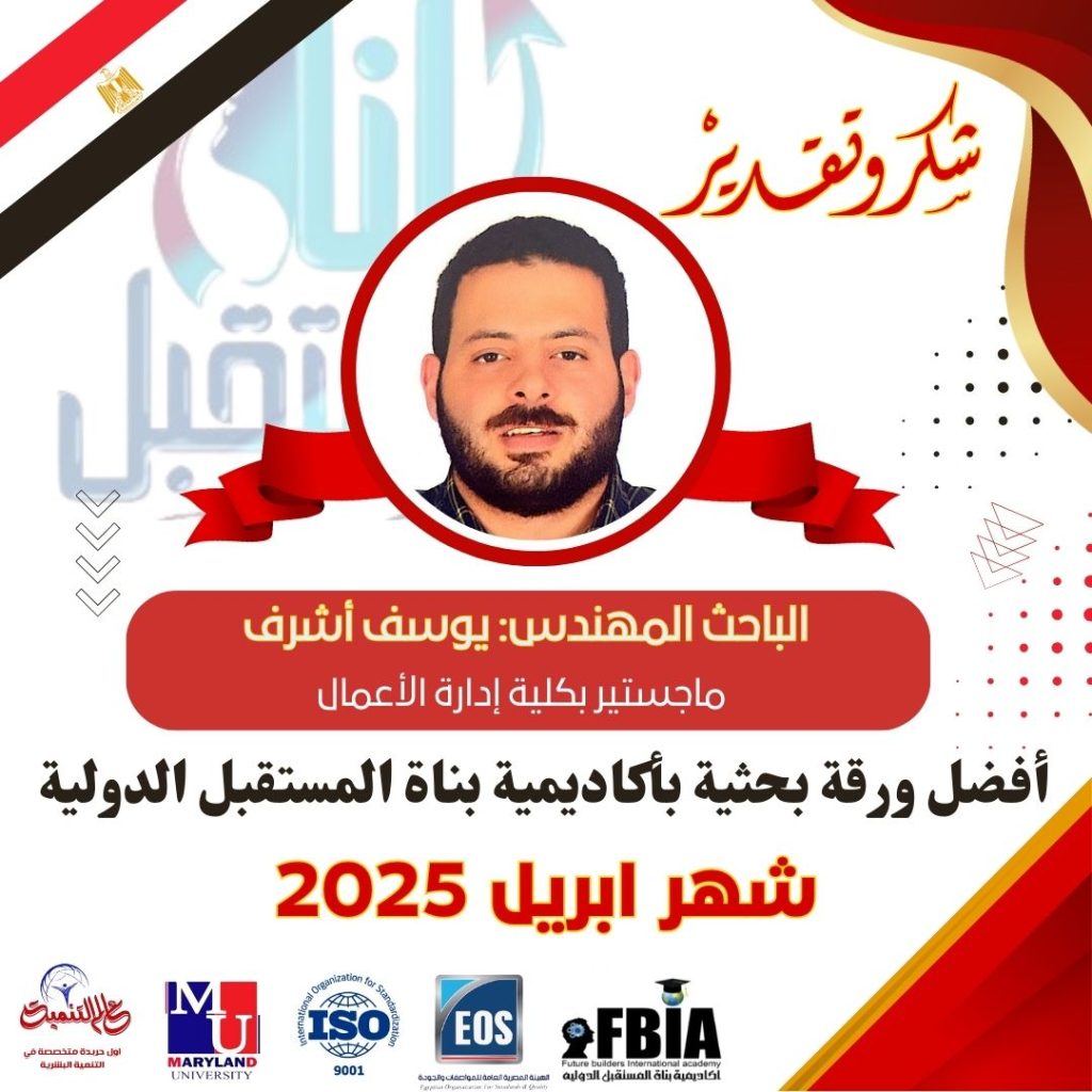 أعلنت أكاديمية بناة المستقبل الدولية برئاسة الدكتورة مها فؤاد، عن فوز الباحث يوسف أشرف أحمد فؤاد من جمهورية مصر العربية، بجائزة أفضل ورقة بحثية لشهر أبريل 2025، ضمن برامج كلية إدارة الأعمال، وذلك عن بحثه المتميز بعنوان: ” استراتيجيات التصنيع المستدام لتعزيز الميزة التنافسية: دراسة اقتصادية على فرص نمو المنتجات الهندسية في الأسواق الإفريقية.”
