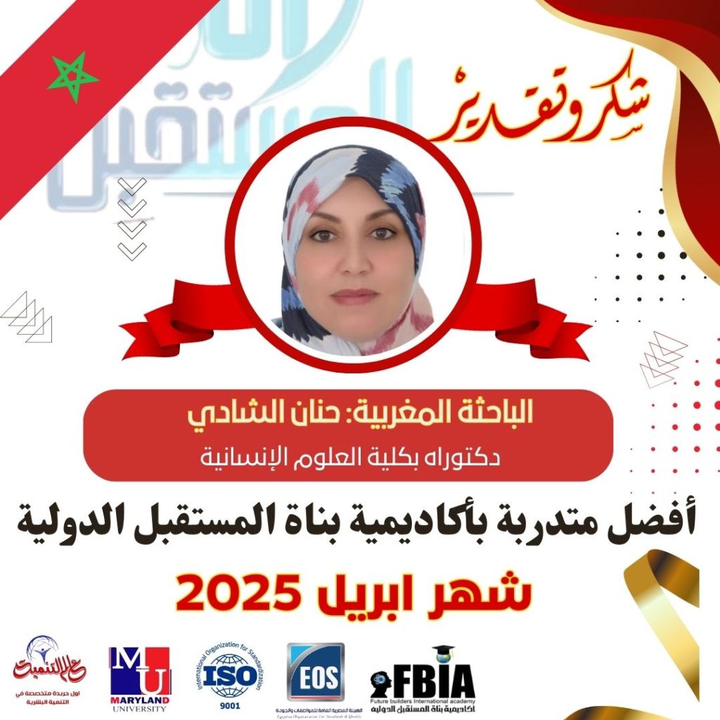 أعلنت أكاديمية بناة المستقبل الدولية برئاسة الدكتورة مها فؤاد – بكلية العلوم الإنسانية – عن اختيار الباحثة المغربية حنان الشادي كأفضل متدربة لشهر أبريل 2025، تقديرًا لما أظهرته من تميز والتزام أكاديمي خلال فترة التدريب.