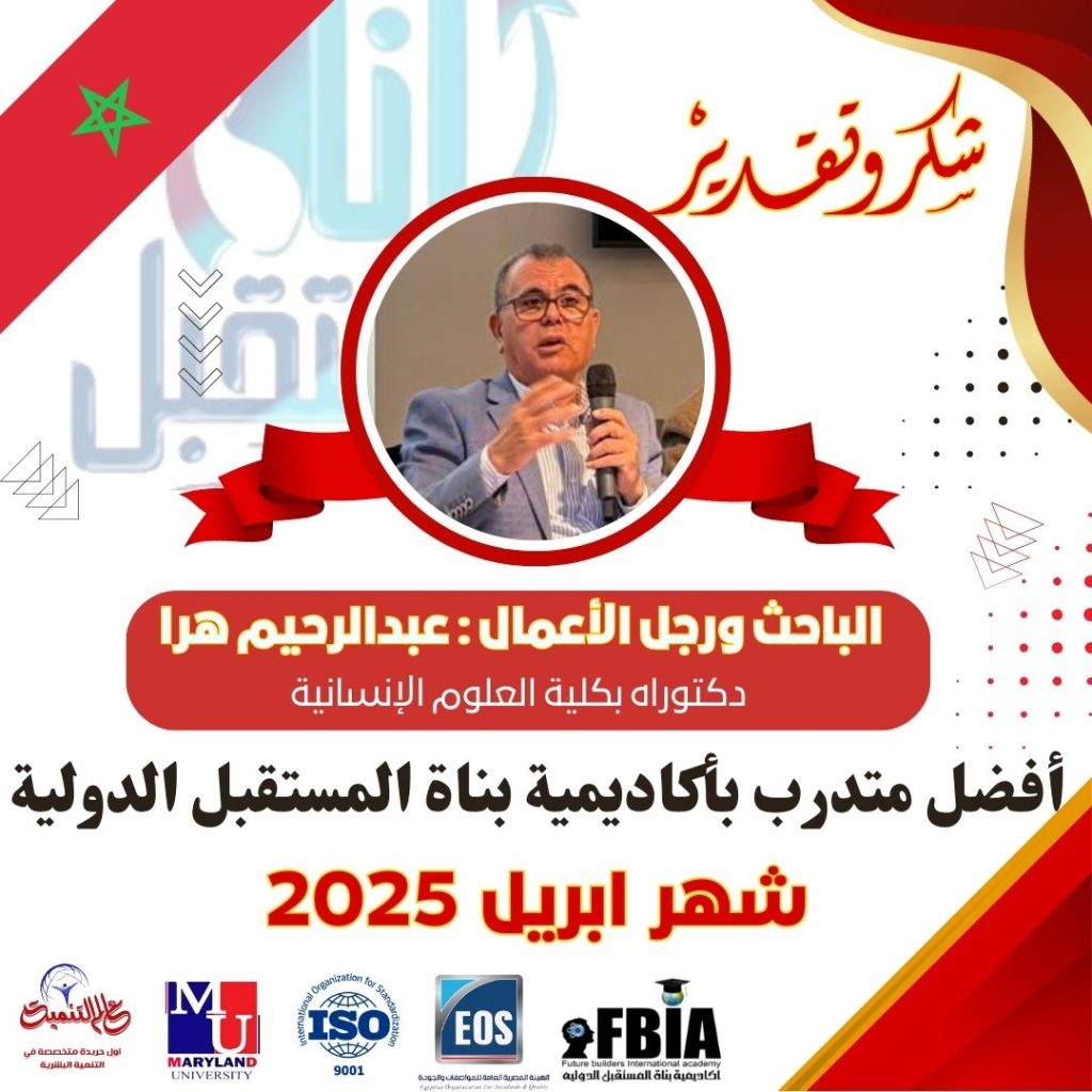 أعلنت أكاديمية بناة المستقبل الدولية بمصر والمغرب والامارات العربية المتحدة برئاسة الدكتورة مها فؤاد، عن فوز الباحث ورجل الأعمال المغربي عبدالرحيم هرا بلقب أفضل متدرب، بكلية إدارة الأعمال الدولية – تخصص الإدارة التربوية، وذلك تقديرًا لأدائه المتميز وجهوده الاستثنائية خلال فترة التدريب الأكاديمي.