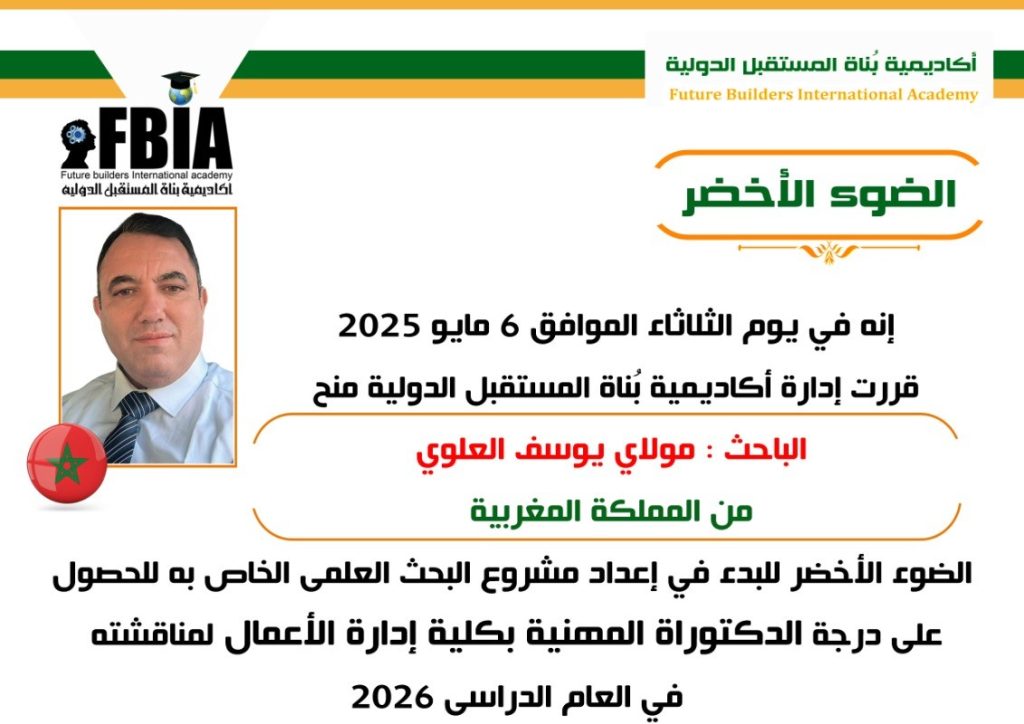 أعلنت أكاديمية بناة المستقبل الدولية، تحت قيادة الدكتورة مها فؤاد، مطورة الفكر الإنساني ورئيسة الأكاديمية، عن منح الباحث المغربي مولاي يوسف العلوي الضوء الأخضر للبدء في إعداد مشروعه البحثي للحصول على درجة الدكتوراه المهنية في إدارة الأعمال للعام الدراسي 2025–2026.