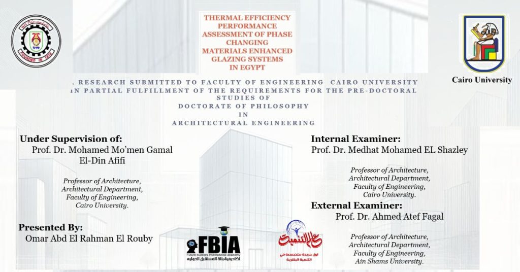 تحت إشراف الأستاذ الدكتور محمد مؤمن جمال الدين عفيفي، وبتقييم من الأستاذ الدكتور مدحت محمد الشاذلي (ممتحن داخلي)، والأستاذ الدكتور أحمد عاطف فَجَال (ممتحن خارجي)، استعرض الباحث مساهمته العلمية في استخدام مواد التغير الطوري (PCM) داخل نظم التزجيج الزجاجي، من أجل رفع كفاءة العزل الحراري في المباني المصرية.