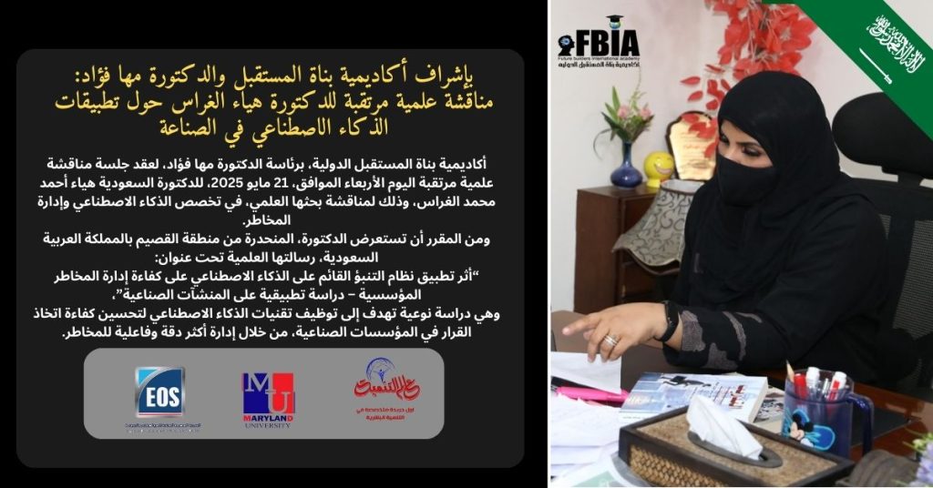 تعقد أكاديمية بناة المستقبل الدولية، برئاسة الدكتورة مها فؤاد، لعقد جلسة مناقشة علمية مرتقبة اليوم الأربعاء، 21 مايو 2025، للدكتورة السعودية هياء أحمد محمد الغراس، وذلك لمناقشة بحثها العلمي في تخصص الذكاء الاصطناعي وإدارة المخاطر.
