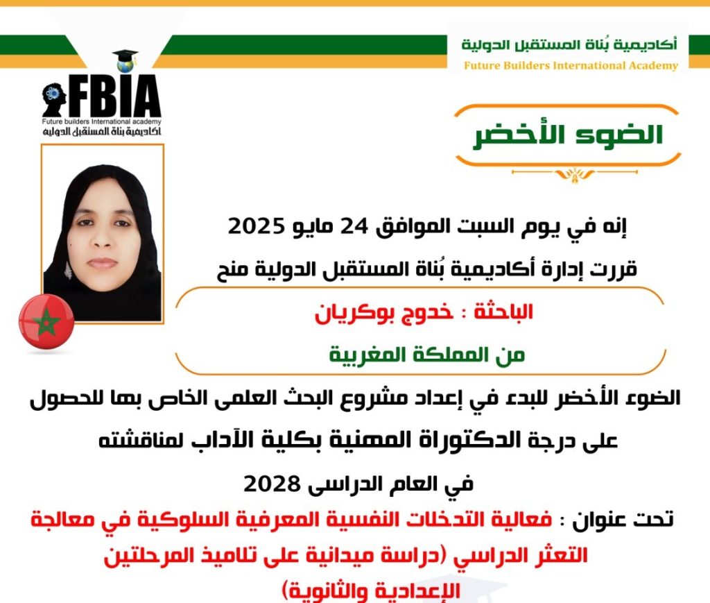 أعلنت أكاديمية بناة المستقبل الدولية، برئاسة الدكتورة مها فؤاد – مطورة الفكر الإنساني – عن منح الباحثة خدوج بوكريان من المملكة المغربية، الضوء الأخضر للبدء في إعداد مشروعها البحثي للحصول على درجة الدكتوراه المهنية في كلية الآداب، ضمن خطة الأكاديمية للعام الدراسي الجديد 2025.