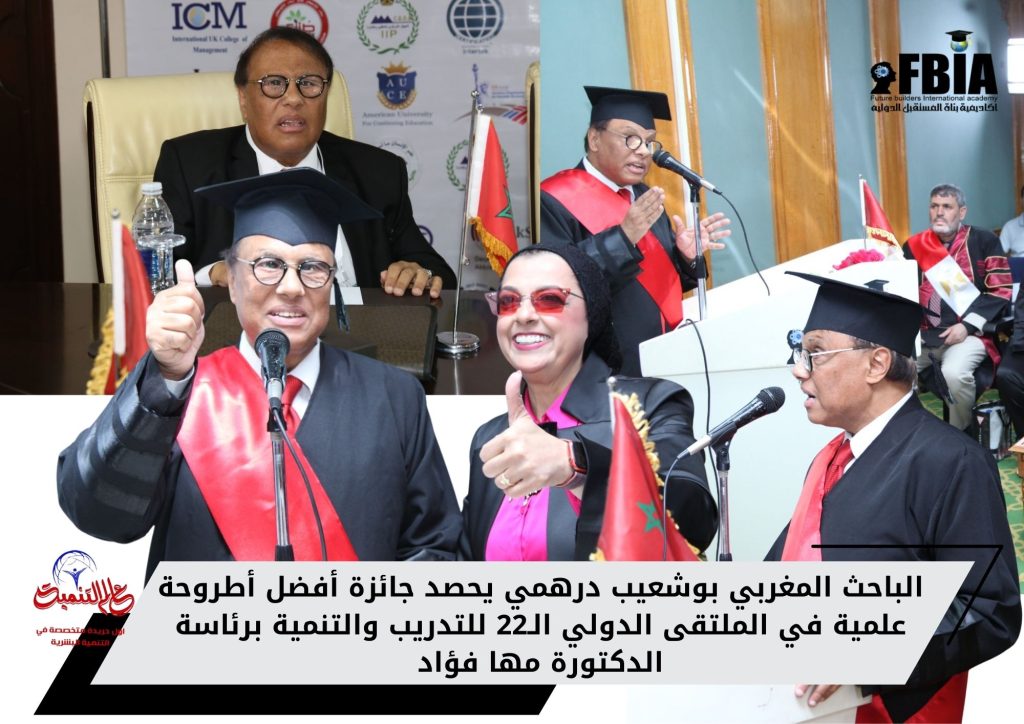 وقد توج الباحث المغربي بوشعيب درهمي، ابن مدينة الدار البيضاء، بجائزة أفضل أطروحة علمية في هذا الحدث العلمي المرموق، عن أطروحته لنيل درجة الدكتوراه في إدارة الأعمال، والتي حملت عنوان: