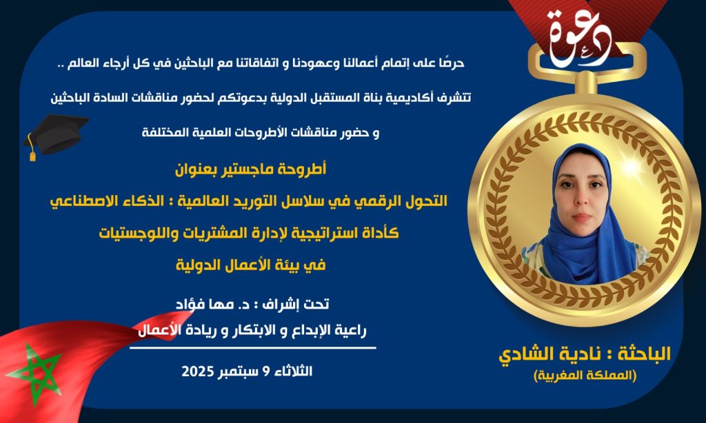 تشرف أكاديمية بناة المستقبل الدولية بدعوتكم لحضور المناقشة العلمية لأطروحة الماجستير المقدمة من الباحثة “نادية الشادي” من المملكة المغربية – مدينة الدار البيضاء، وذلك يوم الثلاثاء الموافق 9 سبتمبر 2025.