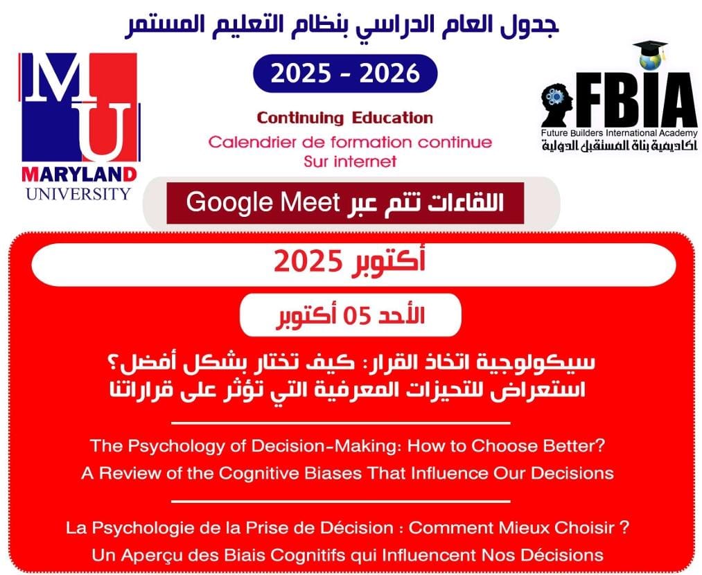 في إطار جهودها المستمرة لتعزيز التفكير العلمي وتنمية مهارات الباحثين العرب، أعلنت أكاديمية بناة المستقبل الدولية عن انطلاق اللقاء العلمي الأول للعام الدراسي الجديد تحت عنوان «سيكولوجية اتخاذ القرار: كيف تختار بشكل أفضل؟»، وذلك غدًا الأحد عبر برنامج Google Meet.