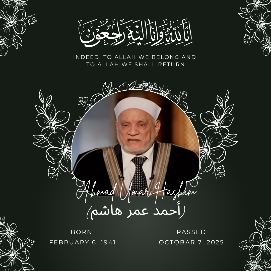 “رحم الله العالم الجليل الأستاذ الدكتور أحمد عمر هاشم، وجزاه خير الجزاء على ما قدّم للأزهر الشريف وللأمة الإسلامية من علمٍ وجهدٍ وعطاء، وأسكنه فسيح جناته مع النبيين والصديقين والشهداء والصالحين، وحسن أولئك رفيقًا.”