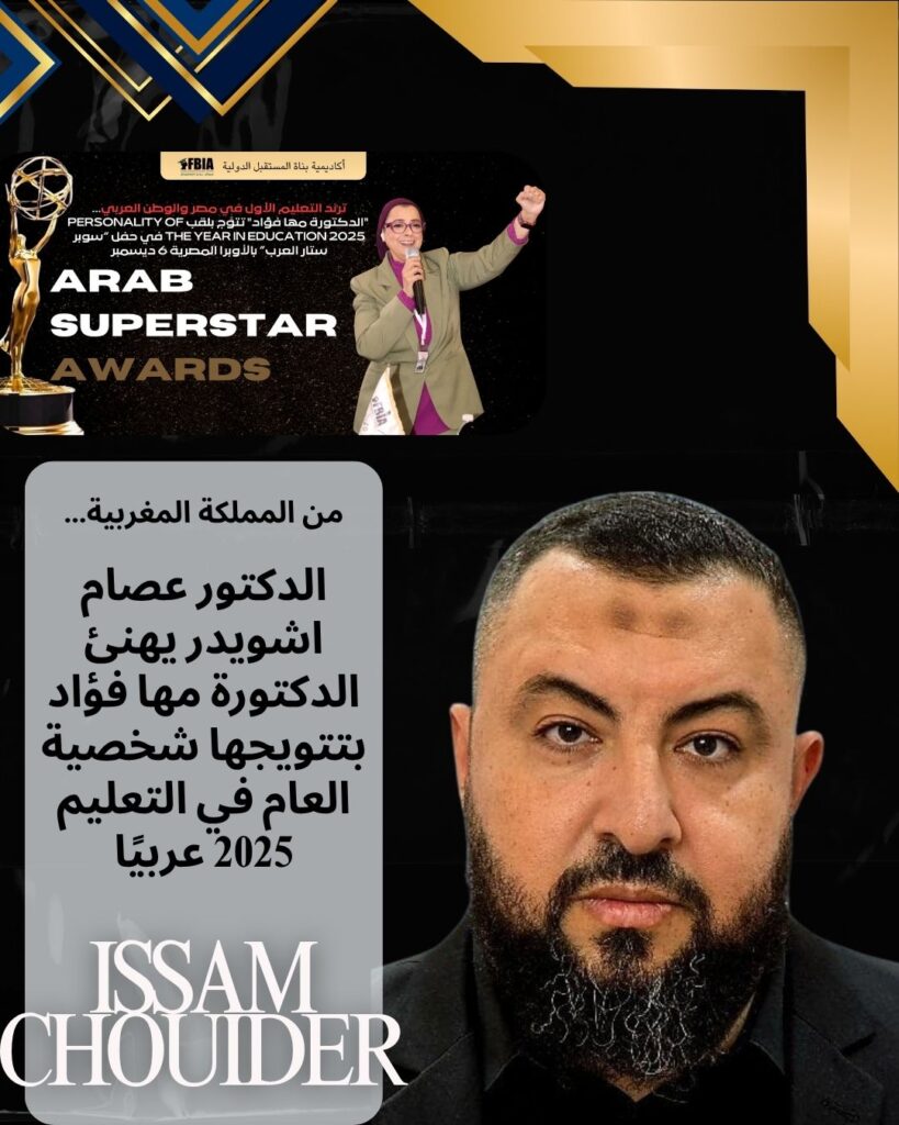 وجه الدكتور المغربي عصام أشويدر، دكتوراه في الآداب – تخصص علم النفس والإرشاد، وابن مدينة أكدال والمقيم بمدينة سلا، تهنئة رسمية للدكتورة مها فؤاد، رئيسة أكاديمية بناة المستقبل الدولية، بمناسبة اختيارها شخصية العام في التعليم 2025 على مستوى مصر والوطن العربي، ضمن فعاليات حفل سوبر ستار العرب المقرر إقامتها بدار الأوبرا المصرية يوم السادس من ديسمبر.
