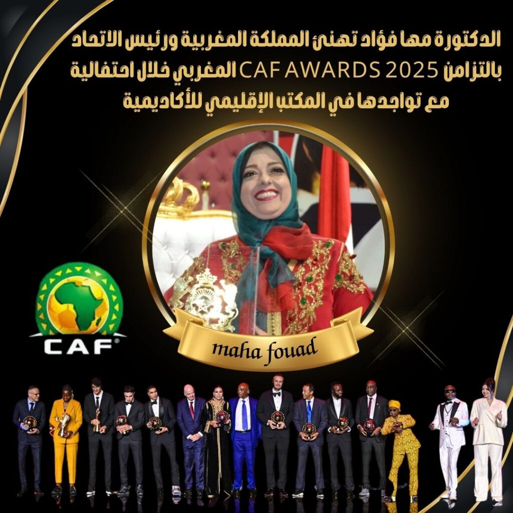 تتقدم الدكتورة مها فؤاد بخالص التهنئة للمملكة المغربية وللاتحاد المغربي لكرة القدم برئاسة السيد فوزي لقجع، وذلك بعد الفوز المستحق بخمس جوائز كروية كبرى في حفل CAF Awards 2025، والذي استضافته جامعة محمد السادس للتكنولوجيا متعددة التخصصات بالرباط يوم 19 نوفمبر.