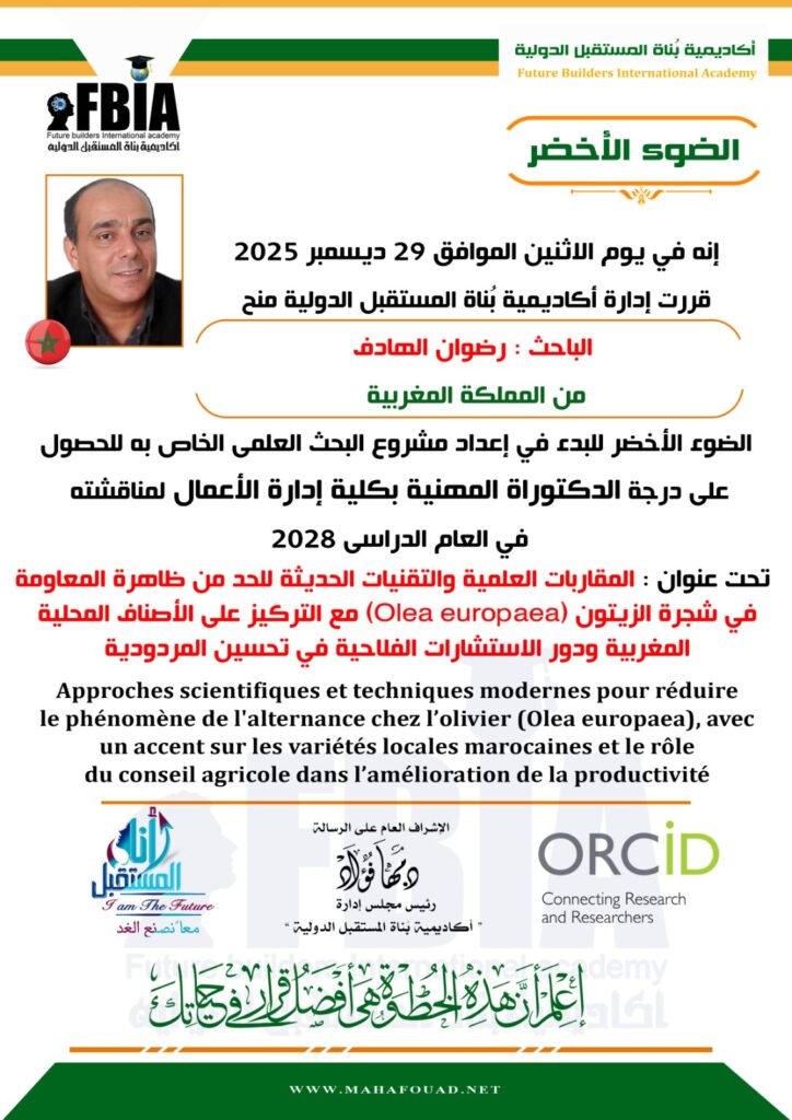 وقد اختار الباحث عنوان ذات طابع عصري وهو” المقاربات العلمية والتقنيات الحديثة للحد من ظاهرة المعاومة في شجرة الزيتون مع التركيز على الأصناف المحلية المغربية ودور الاستشارات الفلاحية في تحسين المردودية”.