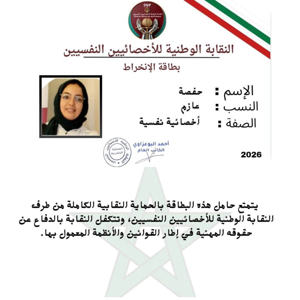 حصلت الدكتورة حفصة عازم على بطاقة الانخراط ضمن النقابة الوطنية للأخصائيين النفسيين، في خطوة تعكس حرصها على تطوير أدائها المهني والمساهمة في الارتقاء بمجال علم النفس بالمغرب، في إطار تعزيز المسار المهني وتكريس الانخراط الفعّال في العمل النقابي والعلمي.