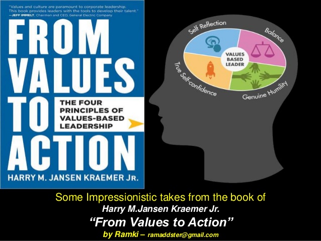 إن الطريق إلى القيادة القيمية ينحصر ما بين نقطتين كلتاهما قائمة على المبادئ الأربعة الرئيسية للقيادة القيمية. تلك المبادئ هي التأمل الذاتي، والتوازن، والثقة بالنفس، وأخيرًا التواضع. تتداخل وتتشابك هذه المبادئ بحيث يُفيد ويُضيف كل منها إلى الآخر وتشكل معًا أساسًا قويًا وأرضًا صلبة للقيادة القيمية.