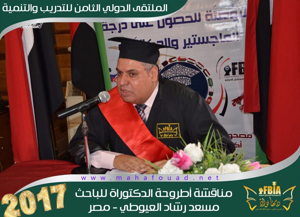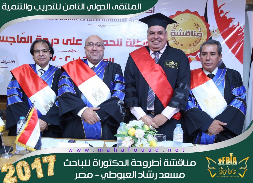 في إطار “الملتقى الدولي الثامن للتدريب والتنمية”، عقدت “أكاديمية بناة المستقبل الدولية” في شهر اغسطس للعام الدراسي 2017مناقشة علمية لأطروحة الدكتوراه”الإعلام الرياضي المرئي وأثره في تشكيل الثقافة الرياضية لدى الجمهور المصري” قدمها الباحث ” مسعد رشاد العيوطي”.