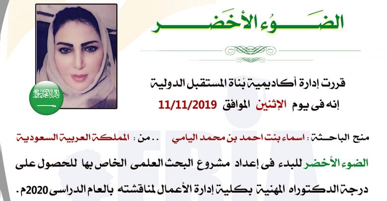 أكاديمية بناة المستقبل الدولية “تمنح الضوء الأخضر للباحث” اسماء بنت احمد بن محمد اليامي للحصول على الدكتوراه المهنيه