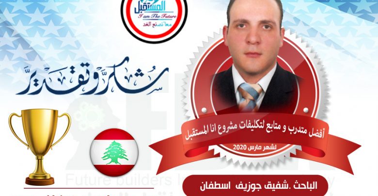 في سلسلة أفضل متدرب ومتابع لتكليفات مشروعات “اننا المستقبل في هذا الشهر منحت الدكتورة “مها فؤاد” أم المدربين العرب ومطورة الفكر الإنساني ورئيسة جريدة عالمل التنمية وأكاديمية بناة المستقبل الدولية، شهادة تقدير أفضل متدرب لشهر “مارس” الباحث ” شفيق جوزيف اسطفان ” من دولة لبنان، بعد اجتماع الدكتورة مها فؤاد وفريق عمل أكاديمية بناة المستقبل.