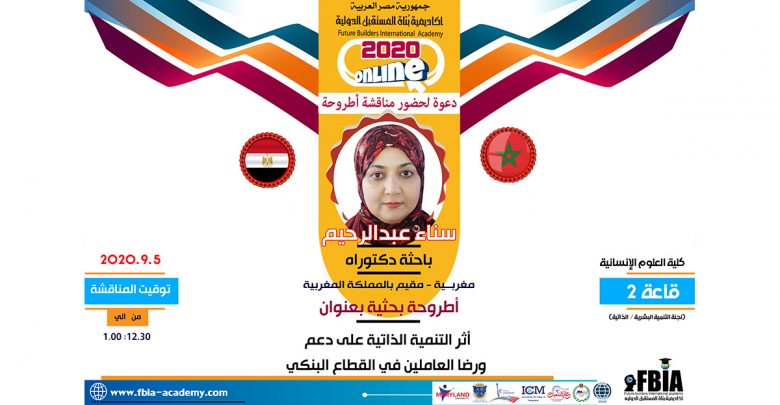 تتشرف اكاديمية #بناة_المستقبل الدولية #FBIA برئاسة الدكتورة “مها فؤاد” أم المدربين العرب ومطورة الفكر الإنساني ورئيسة جريدة عالم التنمية، بدعوة جميع الباحثيين وأصحاب العلم للمشاركة في الملتقي الدولي الحادي عشر للتدريب والتنمية بتاريخ ( 5 سبتمبر2020 )، لمناقشة الدراسة العلمية لباحثة الدكتوراه ” سناء عبدالرحيم” من المملكة المغربية بكلية العلوم الإنسانية (لجنة التنمية البشرية / الذاتية ) عبر الغرفة الإلكترونية بالصوت والصورة بقاعة (2) ، تحت عنوان ” أثر التنمية الذاتية على دعم ورضا العاملين في القطاع البنكي ” .