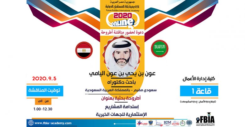 تتشرف اكاديمية #بناة_المستقبل الدولية #FBIA برئاسة الدكتورة “مها فؤاد” أم المدربين العرب ومطورة الفكر الإنساني ورئيسة جريدة عالم التنمية، بدعوة جميع الباحثيين وأصحاب العلم للمشاركة في الملتقي الدولي الحادي عشر للتدريب والتنمية بتاريخ ( 5 سبتمبر2020 )، لمناقشة الدراسة العلمية لباحث الدكتوراه “عون بن يحي بن عون اليامي” من المملكة العربية السعودية بكلية إدارة الأعمال (لجنة إدارة الأعمال /إدارة المشروعات) عبر الغرفة الإلكترونية بالصوت والصورة بقاعة (1) ، تحت عنوان ” إستدامة المشاريع الإستثمارية للجهات الخيرية ” .