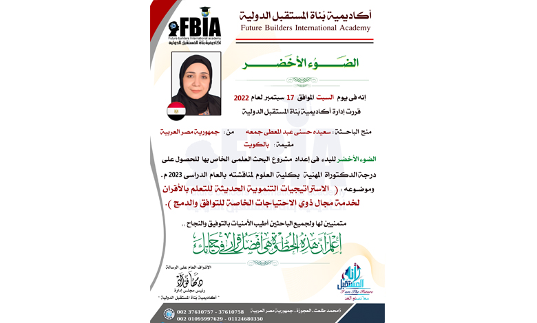 اكاديمية بناة المستقبل الدولية تمنح “الضوء الأخضر” للباحثة سعيده حسنى للحصول على الدكتوراة المهنية