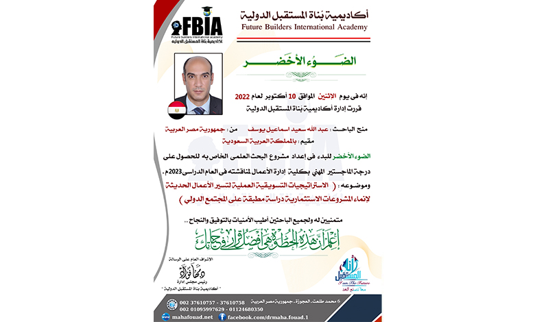 فى إطار ما تقدمة “أكاديمية بناة المستقبل الدولية” تحت قيادة الدكتورة ” #مهافؤاد ” مطورة الفكر الإنسانى ورئيس أكاديمية #بناة المستقبل الدولية وجريدة #عالم_التنمية, وما تطرحة من دبلومات فى مجال #إدارة_الأعمال والتنمية البشرية والعلوم الإنسانية الإرشادية ودرجات علمية للحصول على الماجستير والدكتوراة المهنية, تواصل الباحث/ عبد الله سعيد اسماعيل يوسف من جمهورية مصر العربية ومقيم بالمملكة العربية السعودية مع الأكاديمية للحصول على درجة الماجستير المهني في إدارة الأعمال لعام 2023 من اكاديميه #بناة_المستقبل الدولية #FBIA.