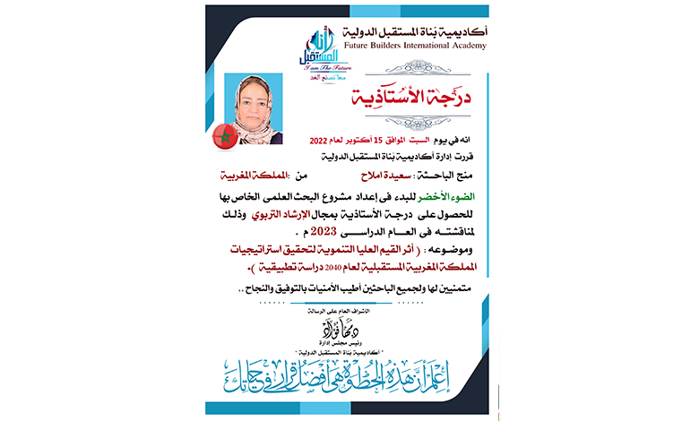 فى إطار ما تقدمة “أكاديمية بناة المستقبل الدولية” تحت قيادة الدكتورة ” #مهافؤاد ” مطورة الفكر الإنسانى ورئيس أكاديمية #بناة المستقبل الدولية وجريدة #عالم_التنمية, وما تطرحة من دبلومات فى مجال #إدارة_الأعمال والتنمية البشرية والعلوم الإنسانية الإرشادية ودرجات علمية للحصول على الماجستير والدكتوراة المهنية, تواصلت الباحثة/ سعيدة املاح من المملكة المغربية للحصول على درجة الأستاذية في العلوم الإنسانية لعام 2023 من اكاديمية #بناة_المستقبل الدولية #FBIA.