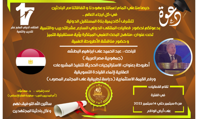 دعوة لحضور مناقشة أطروحة باحث الدكتوراة ”عبد الحميد على ابراهيم البطشه” علي أرض الواقع بجمهورية مصر العربية “أكاديمية بناة المستقبل الدولية”ضمن فعاليات الملتقي البحثي الدولي السابع عشر للتدريب والتنمية 2023.