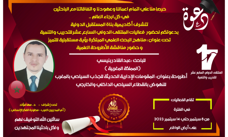 دعوة لحضور مناقشة أطروحة باحث الدكتوراة ”عبدالقادر بنيسي” علي أرض الواقع بجمهورية مصر العربية “أكاديمية بناة المستقبل الدولية”ضمن فعاليات الملتقي البحثي الدولي السابع عشر للتدريب والتنمية 2023.