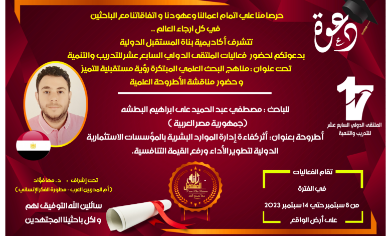 دعوة لحضور مناقشة أطروحة باحث الدكتوراة ”مصطفي عبد الحميد على ابراهيم البطشه” علي أرض الواقع بجمهورية مصر العربية “أكاديمية بناة المستقبل الدولية”ضمن فعاليات الملتقي البحثي الدولي السابع عشر للتدريب والتنمية 2023.