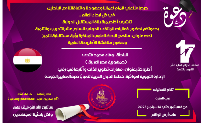 دعوة لحضور مناقشة أطروحة باحثة الدكتوراة ”وفاء محمد فتحى ” علي ارض الواقع بجمهورية مصر العربية “أكاديمية بناة المستقبل الدولية”ضمن فعاليات الملتقي البحثي الدولي السابع عشر للتدريب والتنمية 2023.