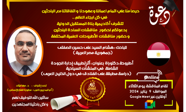 تتشرف أكاديمية بناة المستقبل الدولية FBIA – مصر ، فيوتشر بيلدرز انترناشيونال كومباني – الإمارات ، FBIA ACADEMY PRIVEE – المغرب ، وكلاء جامعة ميريلاند الأمريكية، بدعوتكم لحضور مناقشة أطروحة الدكتوراة عبر شبكة الإنترنت (Google Meet) عن بُعد بالصوت والصورة، لباحث الدكتوراة ” هشام السيد على حسين الصفتى “- من جمهورية مصر العربية مقيم (بالمملكة العربية السعودية) ، وجاءت الأطروحة بعنوان: أثر تطبيق إدارة الجودة الشاملة في المنشآت السياحية (دراسة مطبقة على الفنادق في دول الخليج العربى)
