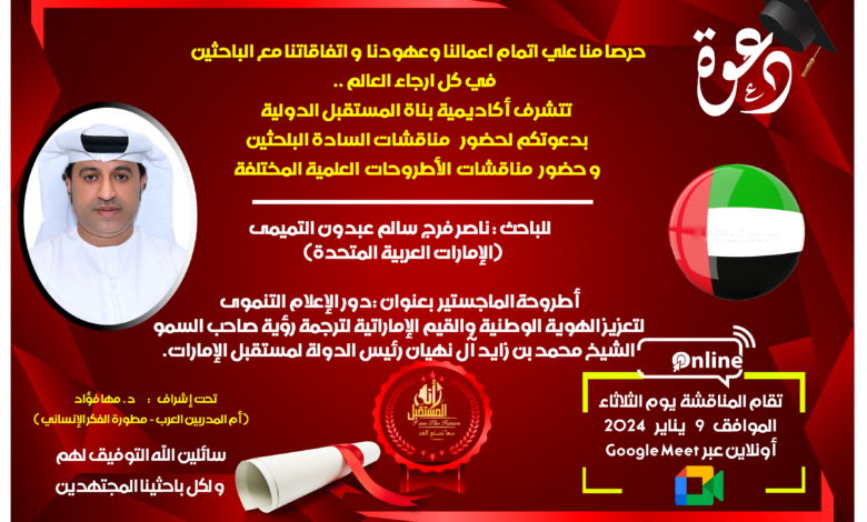 تتشرف أكاديمية بناة المستقبل الدولية FBIA – مصر ، فيوتشر بيلدرز انترناشيونال كومباني – الإمارات ، FBIA ACADEMY PRIVEE – المغرب ، وكلاء جامعة ميريلاند الأمريكية، بدعوتكم لحضور مناقشة أطروحة الدكتوراة عبر شبكة الإنترنت (Google Meet) عن بُعد بالصوت والصورة، لباحث الماجستير “ ناصر فرج سالم عبدون التميمى من الإمارات العربية المتحدة،وجاءت الأطروحة بعنوان : دور الإعلام التنموى لتعزيز الهوية الوطنية والقيم الإماراتية لترجمة رؤية صاحب السمو الشيخ محمد بن زايد آل نهيان رئيس الدولة لمستقبل الإمارات.