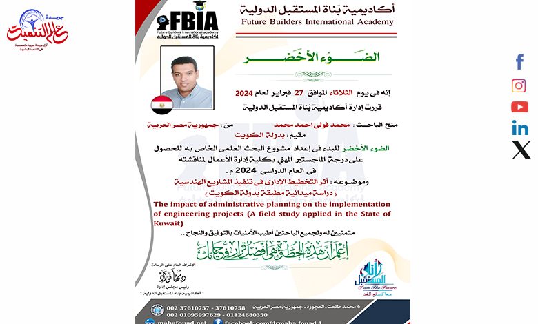 أكاديمية بناة المستقبل الدولية تمنح “الضوء الأخضر” للباحث ” محمد فولى احمد محمد” للحصول على درجة الماجستير المهني…