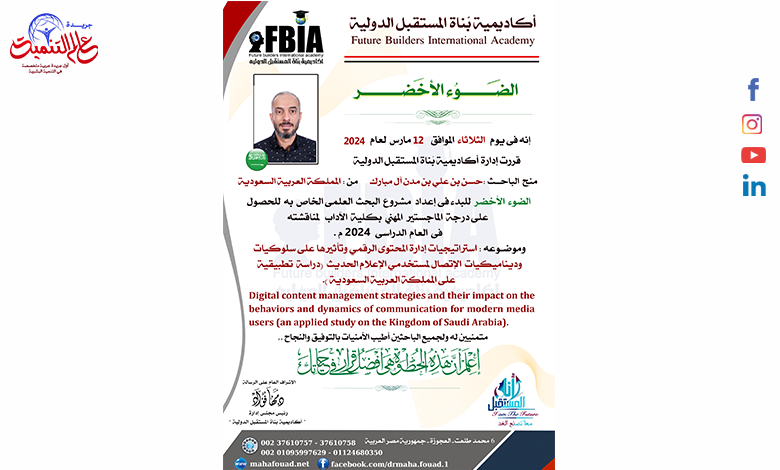 أكاديمية بناة المستقبل الدولية تمنح “الضوء الأخضر” للباحث ” حسن بن علي بن مدن آل مبارك” للحصول على درجة الماجستير  المهني…