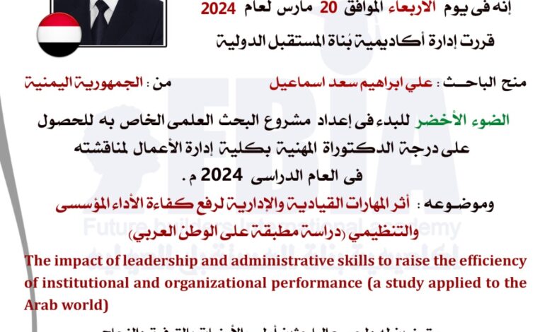 أكاديمية بناة المستقبل الدولية تمنح “الضوء الأخضر” للباحث ” علي ابراهيم سعد اسماعيل ” من الجمهورية اليمنية للحصول على درجة الدكتورة المهنية…..