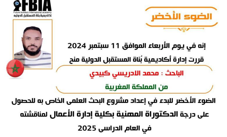 محمد الادريسي كبيدي يحصل على “الضوء الأخضر” للبحث في أكاديمية بناة المستقبل الدولية لنيل الدكتوراة المهنية