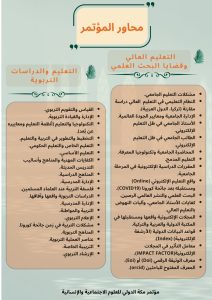 يشمل المؤتمر عدة محاور مهمة من بينها، قضايا التعليم العالي والبحث العلمي، والدراسات التربوية واللغوية، إضافة إلى الموضوعات الاجتماعية والنفسية والفلسفية، كما سيتم تناول قضايا الرياضة والشباب، والفن والتصميم، والدراسات التاريخية والإعلام والاتصال.