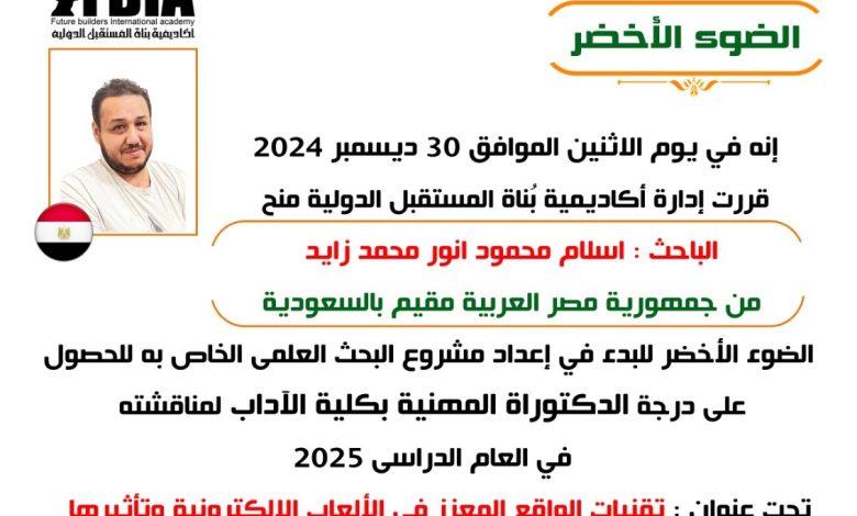اسلام محمود انور محمد زايد يحصل على “الضوء الأخضر” للبحث في أكاديمية بناة المستقبل الدولية لنيل الدكتوراة المهنية