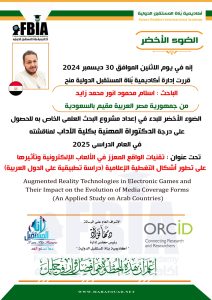 اختار الباحث موضوع رسالته بعنوان” تقنيات الواقع المعزز في الالعاب الالكترونية وتأثيرها على تطور أشكال التغطية الإعلامية (دراسة تطبيقية على الدول العربية)،وقد قدم خطة العمل البحثية الخاصة به للفريق البحثي بالأكاديمية، والتي تم قبولها ليتم العمل عليها خلال العام الدراسي 2025 حتى إتمام البحث والتخرج.