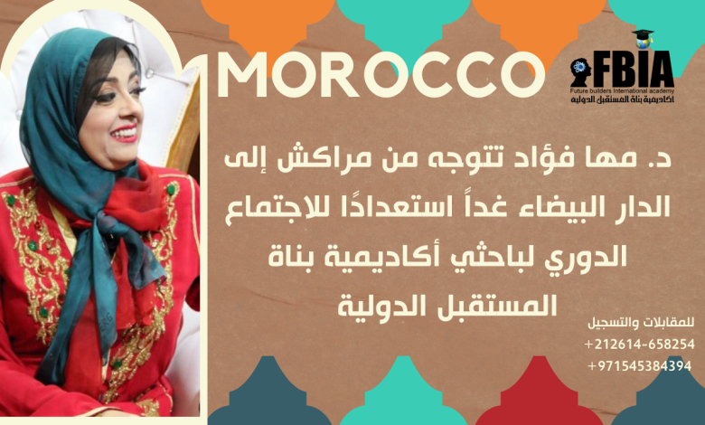 د. مها فؤاد تتوجه من مراكش إلى الدار البيضاء غداً استعدادًا للاجتماع الدوري لباحثي أكاديمية بناة المستقبل الدولية