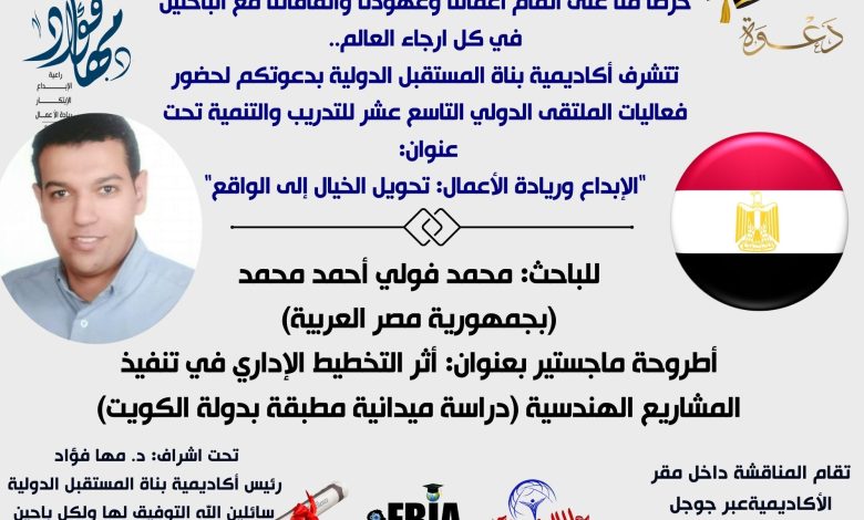 تتشرف أكاديمية بناة المستقبل الدولية FBIA – مصر ، فيوتشر بيلدرز انترناشيونال كومباني – الإمارات ، FBIA ACADEMY PRIVEE – المغرب ، وكلاء جامعة ميريلاند الأمريكية، بدعوتكم لحضور مناقشة أطروحة الماجستير عبر شبكة الإنترنت (Google Meet) عن بُعد بالصوت والصورة، لباحث الماجستير: محمد فولي أحمد محمد، من جمهورية مصر العربية، وجاءت الأطروحة بعنوان: أثر التخطيط الاداري في تنفيذ المشاريع الهندسية ( دراسة ميدانية مطبقة بدولة الكويت)