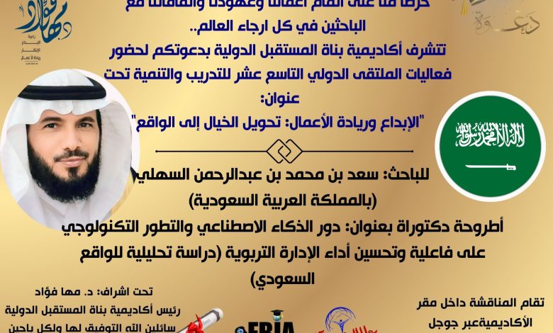 تتشرف أكاديمية بناة المستقبل الدولية FBIA – مصر ، فيوتشر بيلدرز انترناشيونال كومباني – الإمارات ، FBIA ACADEMY PRIVEE – المغرب ، وكلاء جامعة ميريلاند الأمريكية، بدعوتكم لحضور مناقشة أطروحة الدكتوراة عبر شبكة الإنترنت (Google Meet) عن بُعد بالصوت والصورة، لباحث الدكتوراه: سعد بن محمد بن عبدالرحمن السهلي، من المملكة العربية السعودية، وجاءت الأطروحة بعنوان: دور الذكاء الاصطناعي والتطور التكنولوجي على فاعلية وتحسين أداء الإدارة التربوية (دراسة تحليلية للواقع السعودي)