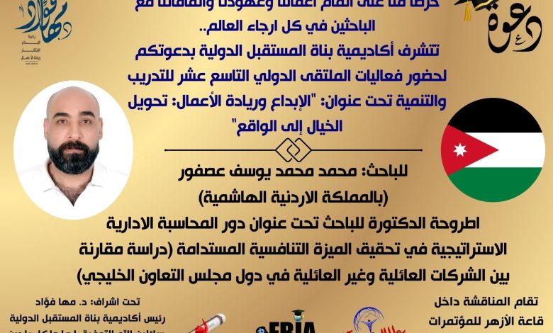 تتناول الأطروحة موضوعًا علميًا متميزًا بعنوان: “دور المحاسبة الإدارية الاستراتيجية في تحقيق الميزة التنافسية المستدامة: دراسة مقارنة بين الشركات العائلية وغير العائلية في دول مجلس التعاون الخليجي”. وتعد هذه الدراسة إضافة هامة إلى مجالي المحاسبة وإدارة الأعمال.