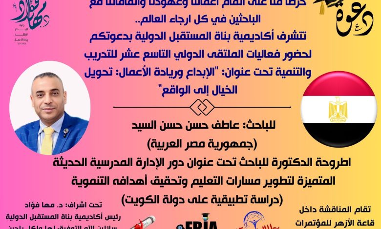 دعوة لحضور مناقشة أطروحة باحث الدكتوراه عاطف حسن حسن السيد ضمن فعاليات الملتقى الدولي التاسع عشر تحت شعار”الإبداع والابتكار وريادة الأعمال: تحويل الخيال إلى واقع”.