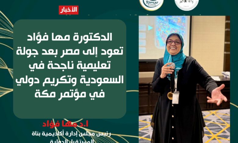 عادت الدكتورة مها فؤاد، رئيس مجلس إدارة أكاديمية “بناة المستقبل الدولية”، إلى مصر بعد جولة تعليمية ناجحة في المملكة العربية السعودية، استغرقت عدة أيام من العمل الأكاديمي والفعاليات المميزة، هذه الزيارة كانت هامة على عدة أصعدة، حيث ساهمت الدكتورة مها فؤاد في تعزيز مكانة الأكاديمية، والتفاعل مع العديد من الأكاديميين والخبراء في المجال العلمي.